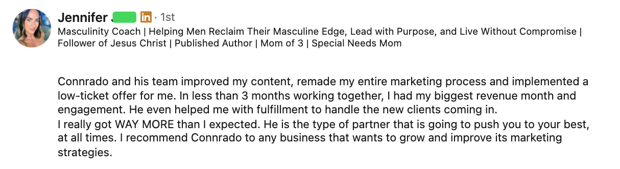 I'm not here to cuddle you. I'm going to challenge your positioning, push you out of your comfort zone, and tell you when something isn't working. I'm a partner who's invested in your growth—not just someone to provide deliverables.