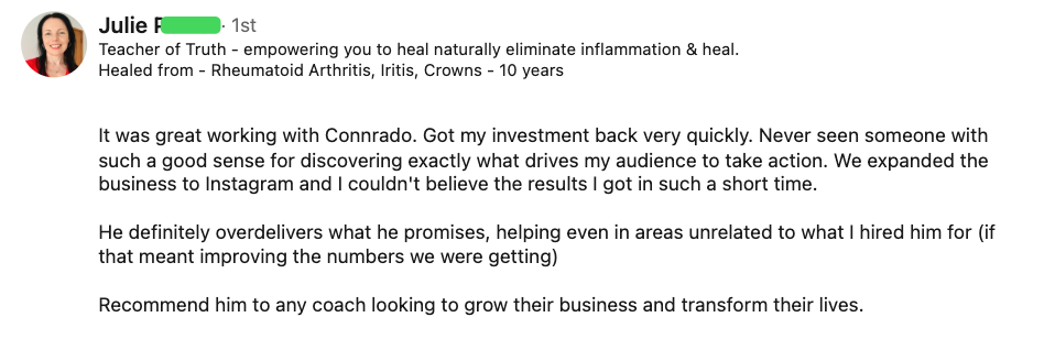 Next, I started working in the coaching space on Instagram and LinkedIn. Mastering how to cut through noise, build authority fast, and sell transformation in highly competitive niches.